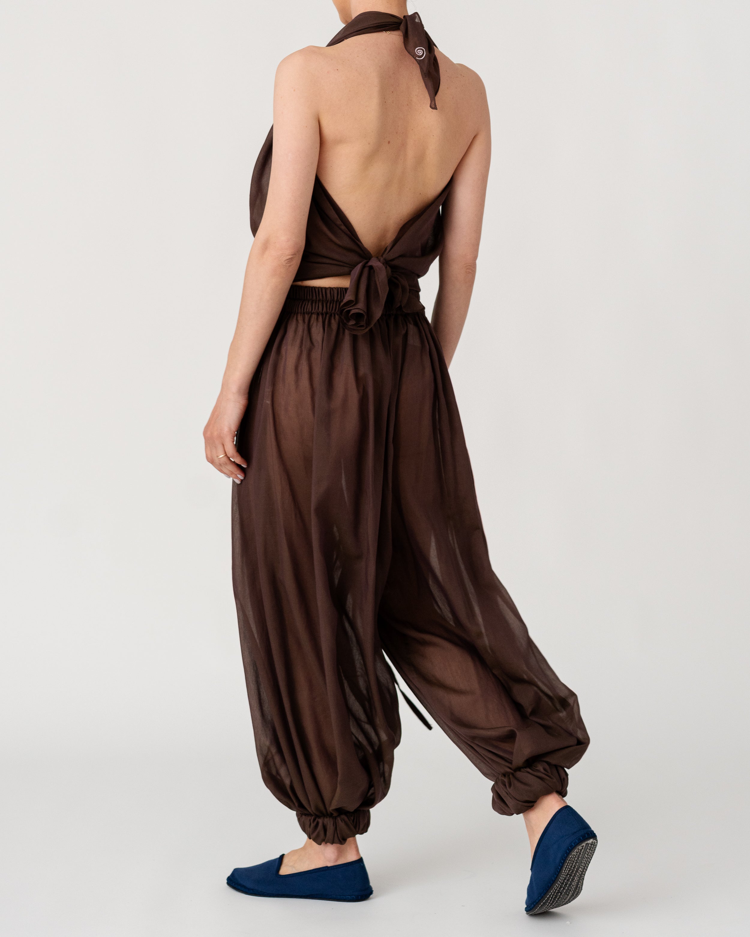 • Open back with long ties that fasten at the back for an adjustable fit.